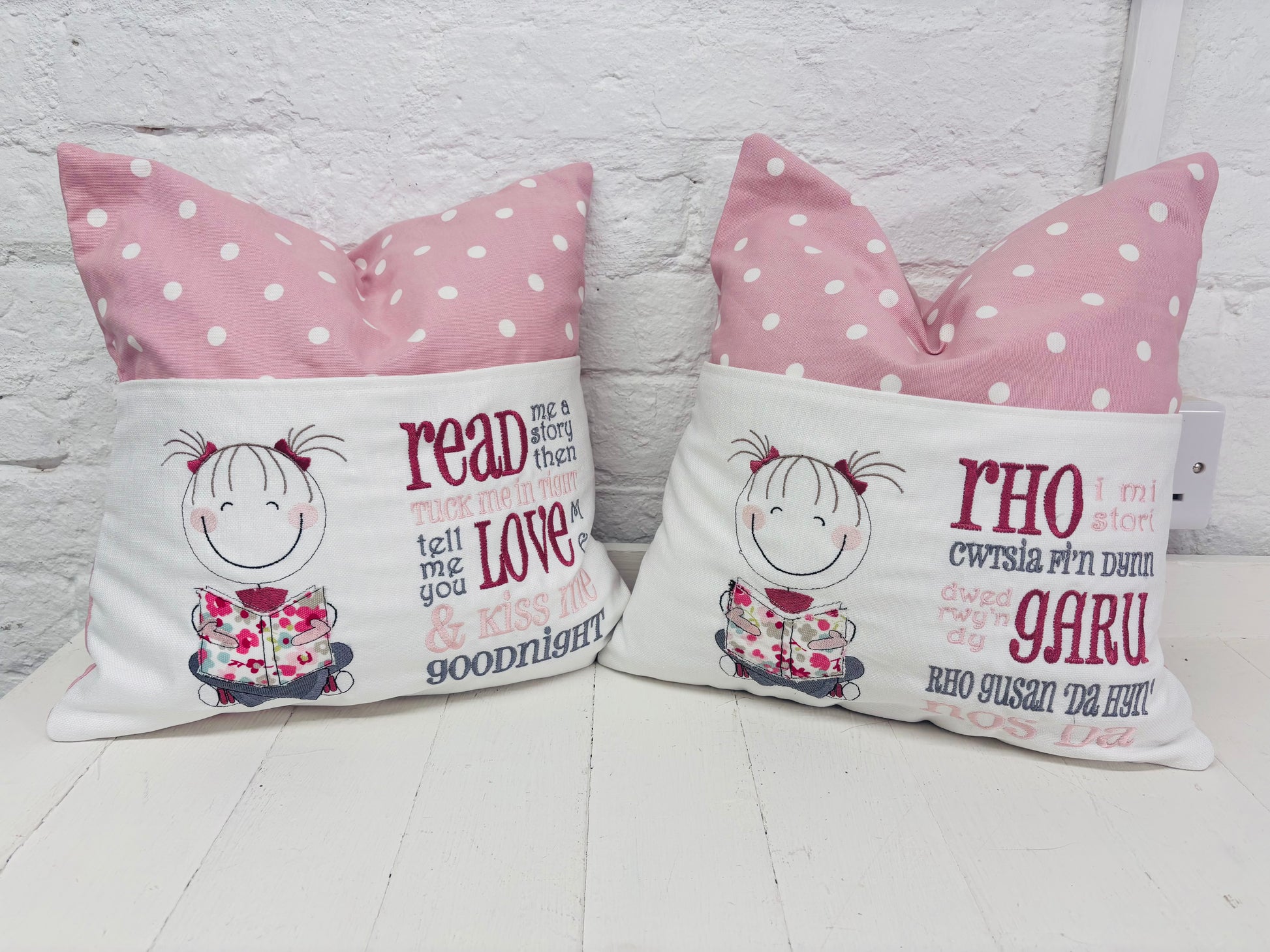Little Girl Children’s Reading Book Cushion available in Welsh or English