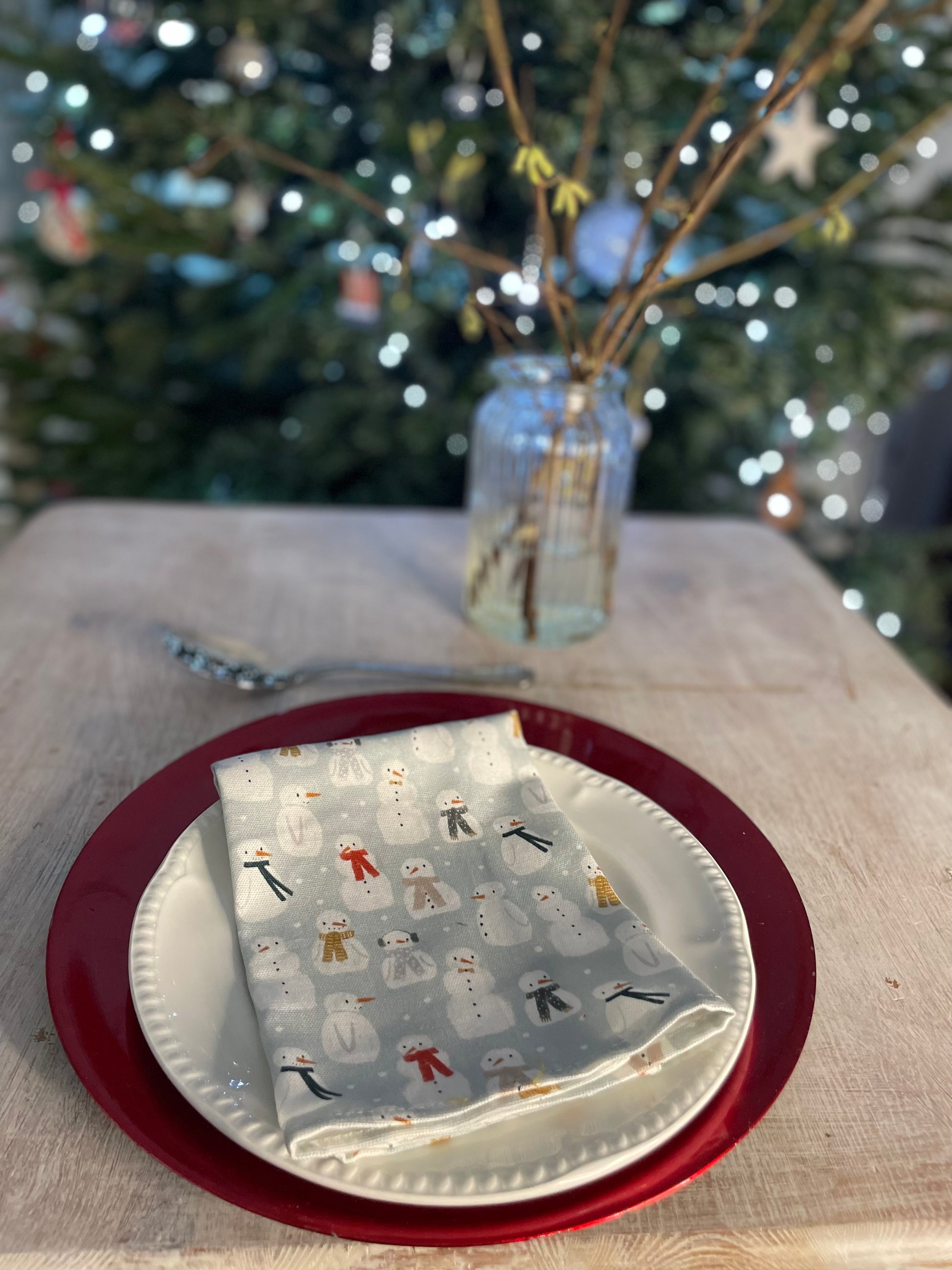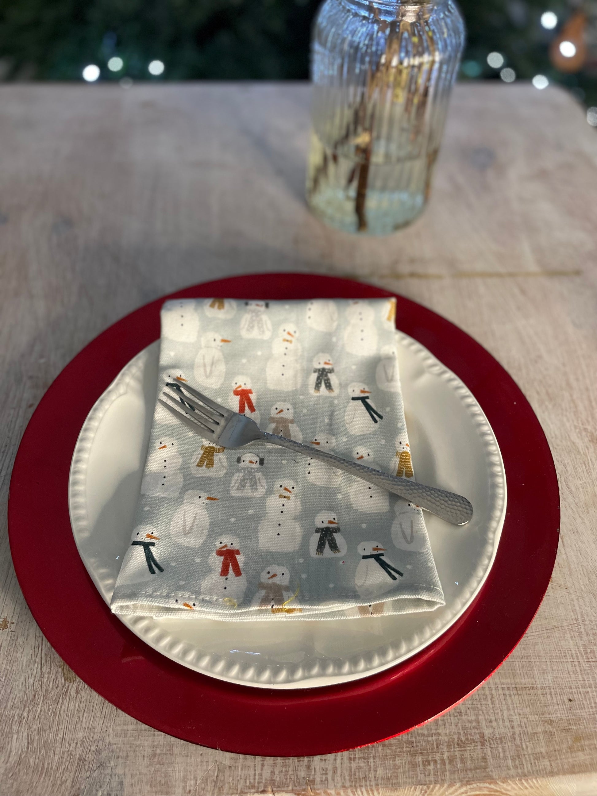 Snow man fabric Napkins Festive table- and Christmas Trees, Handmade festive Napkins - Fabric Napkins