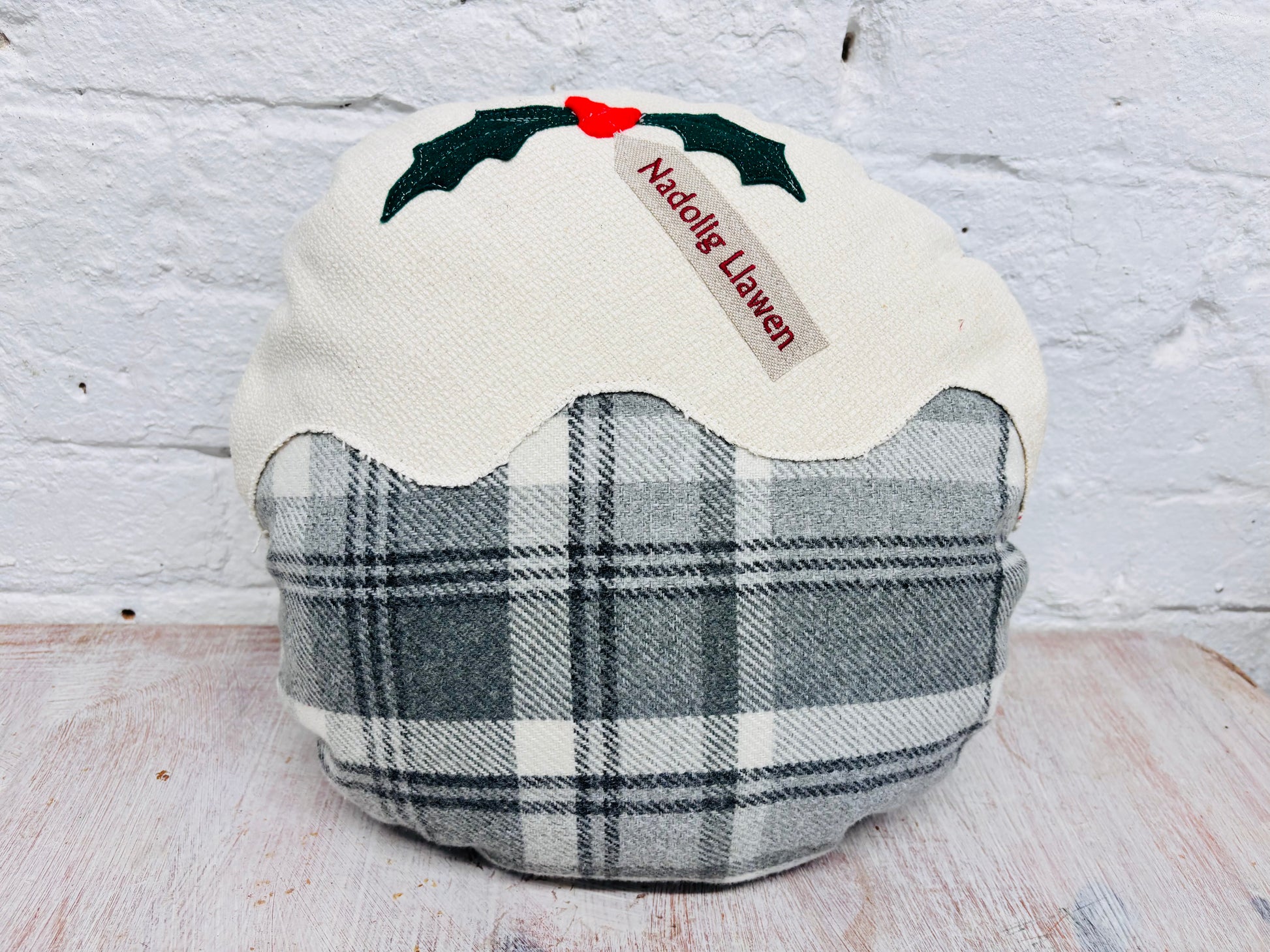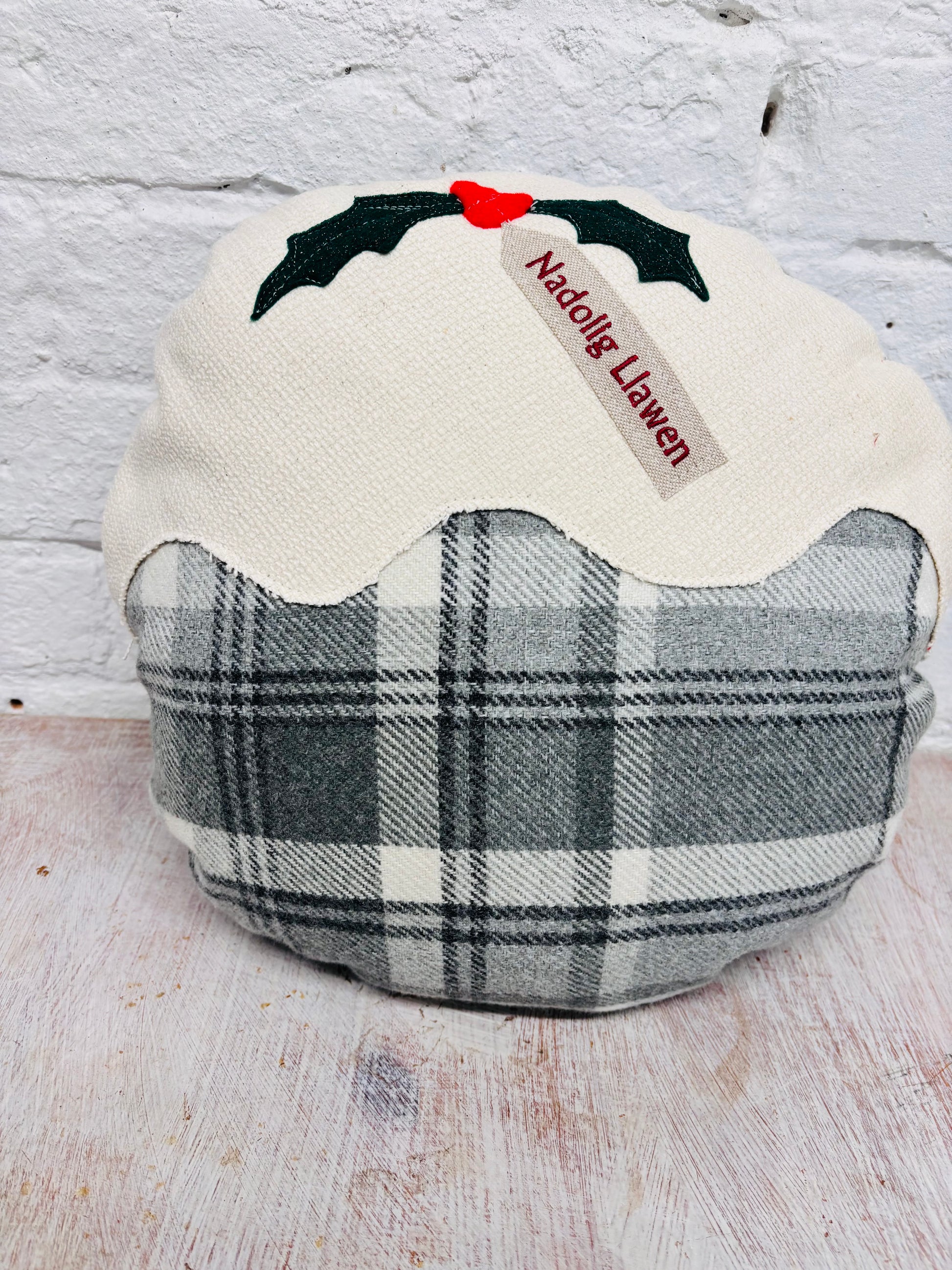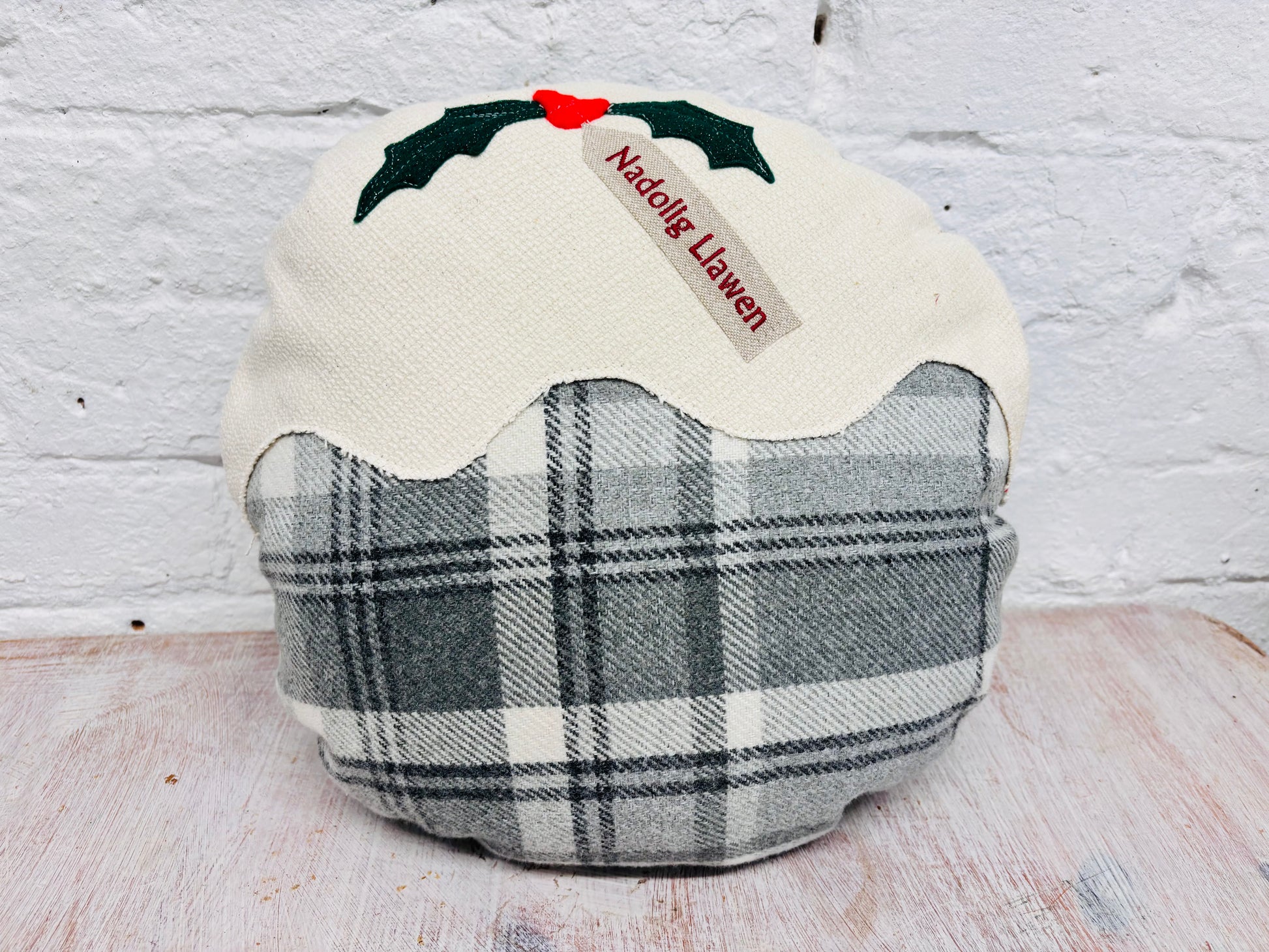 Christmas pudding Nadolig llawen Grey Wool Cushion .