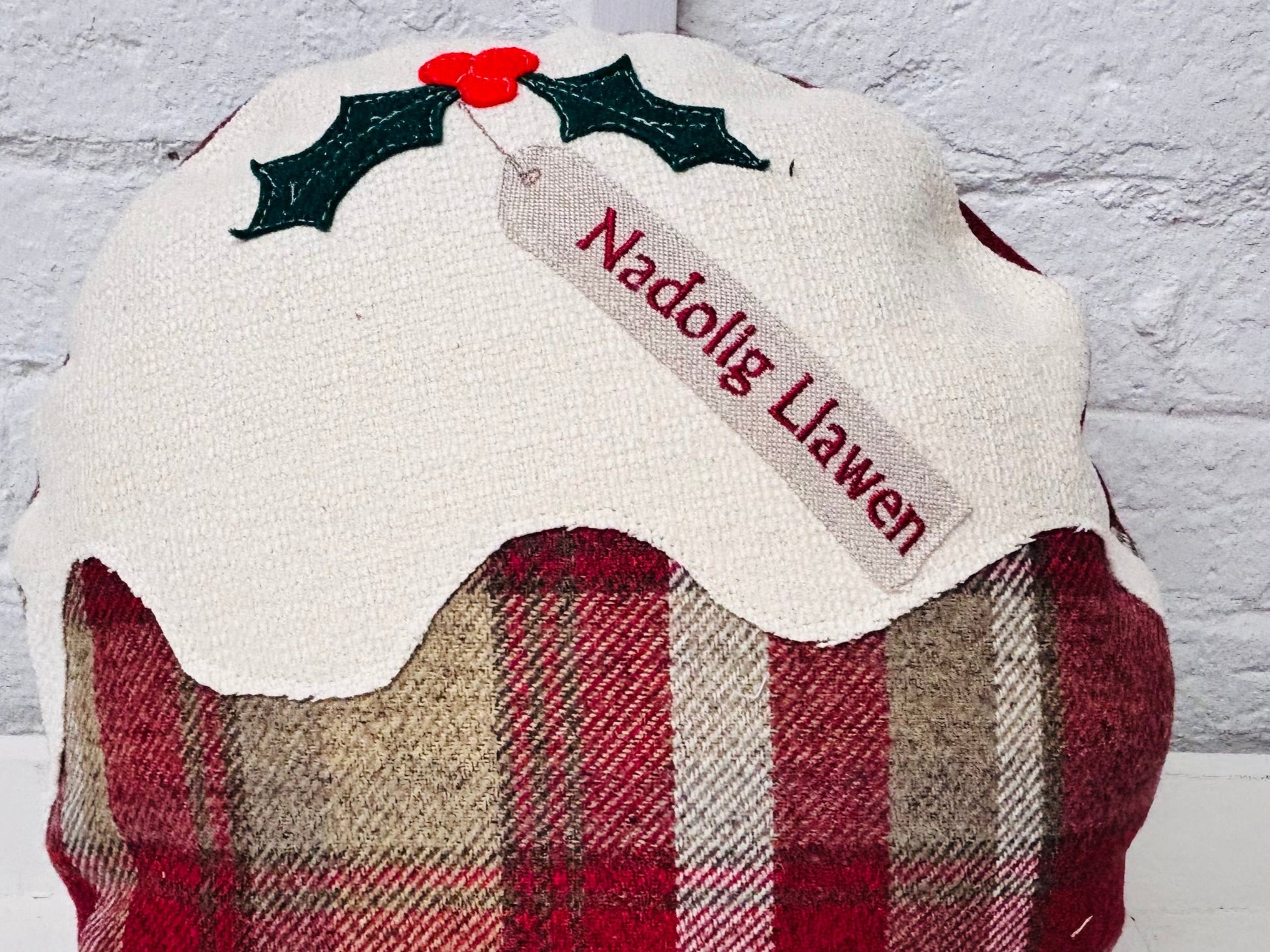 Christmas pudding Nadolig llawen Red Wool Cushion .