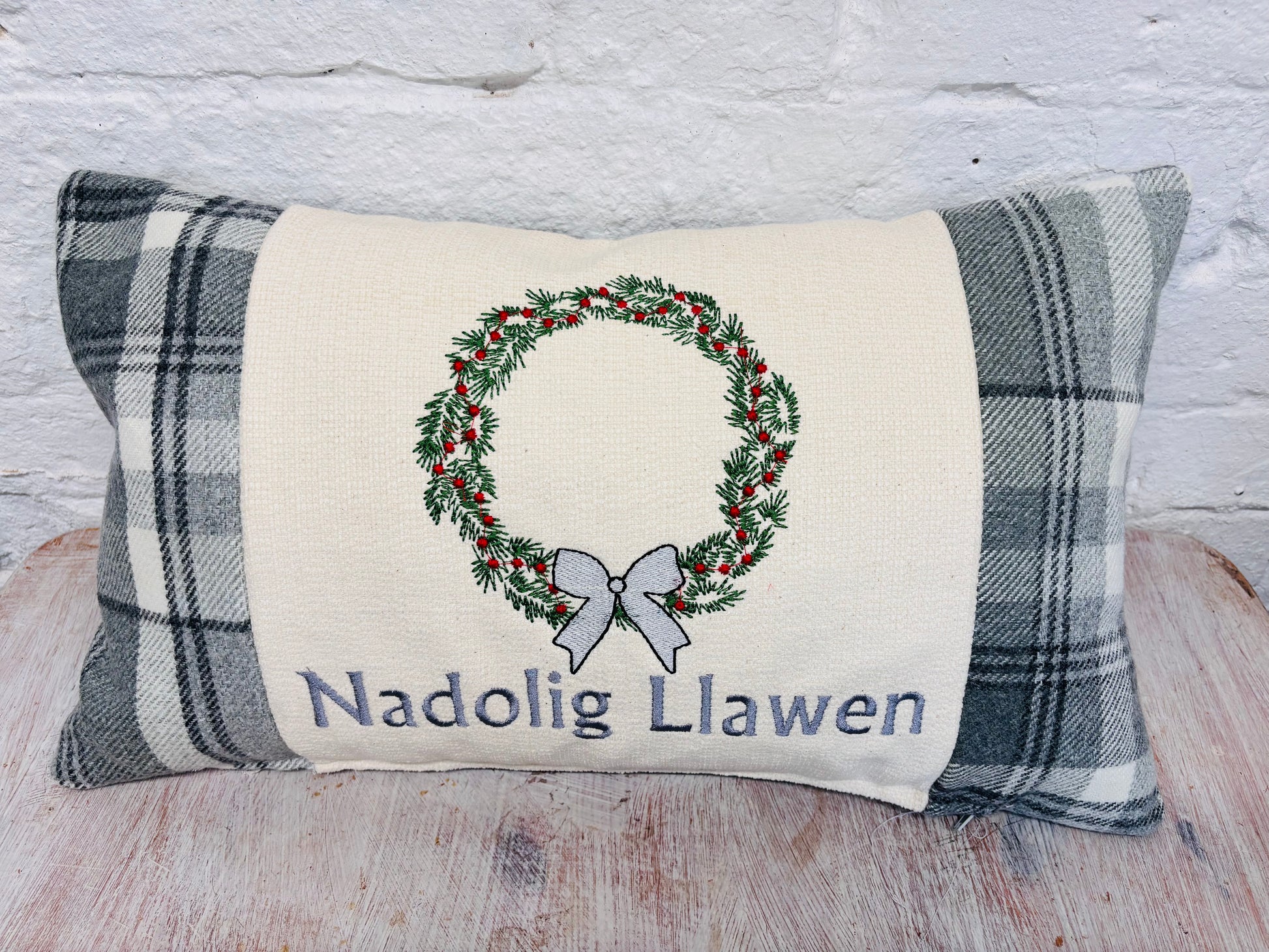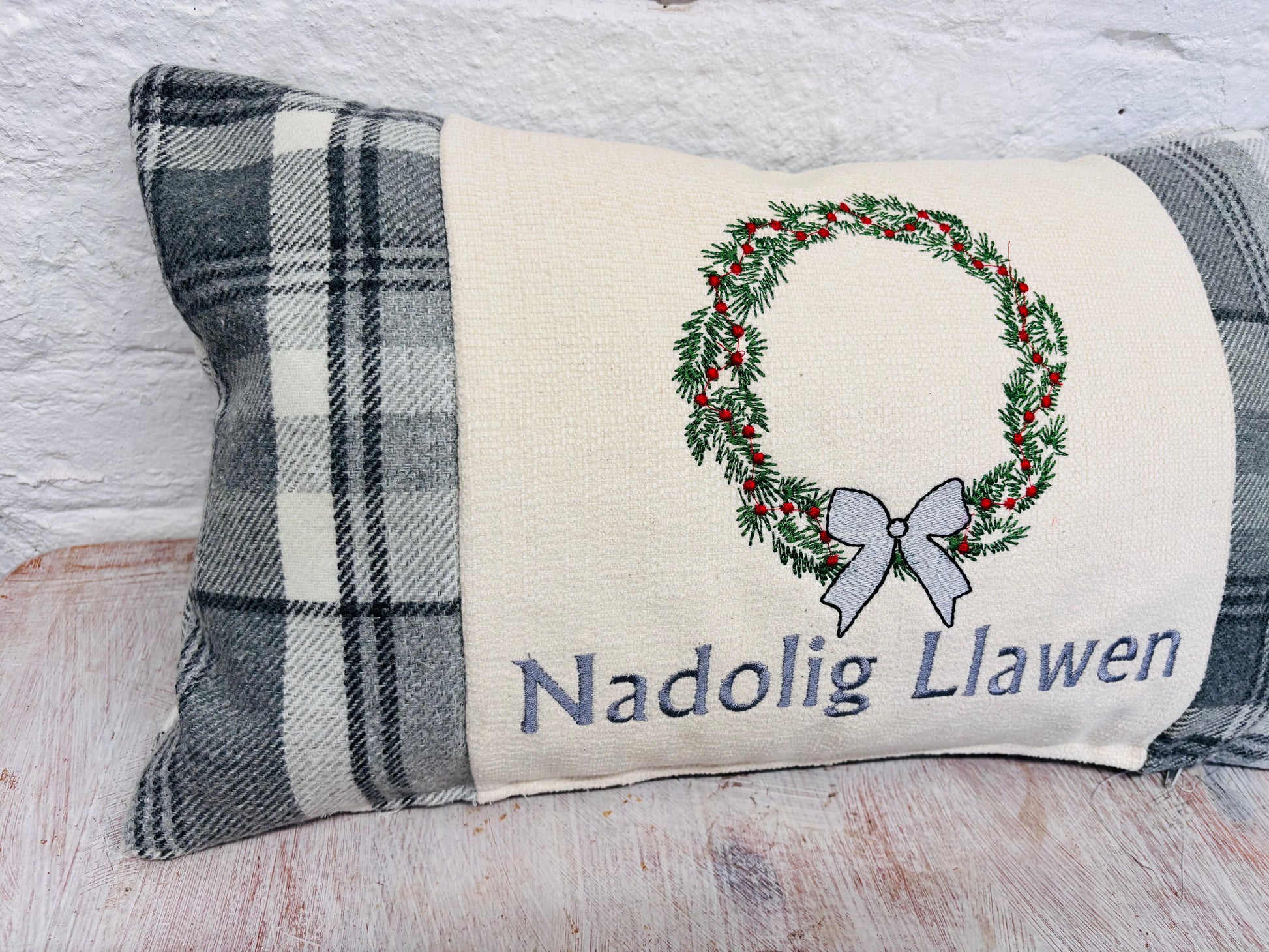 Christmas Wreath with Nadolig Llawen embroidered on a cream panel with our stunning luxury Red and Gold Snow flake Tapestry fabric on both sides and on the back .