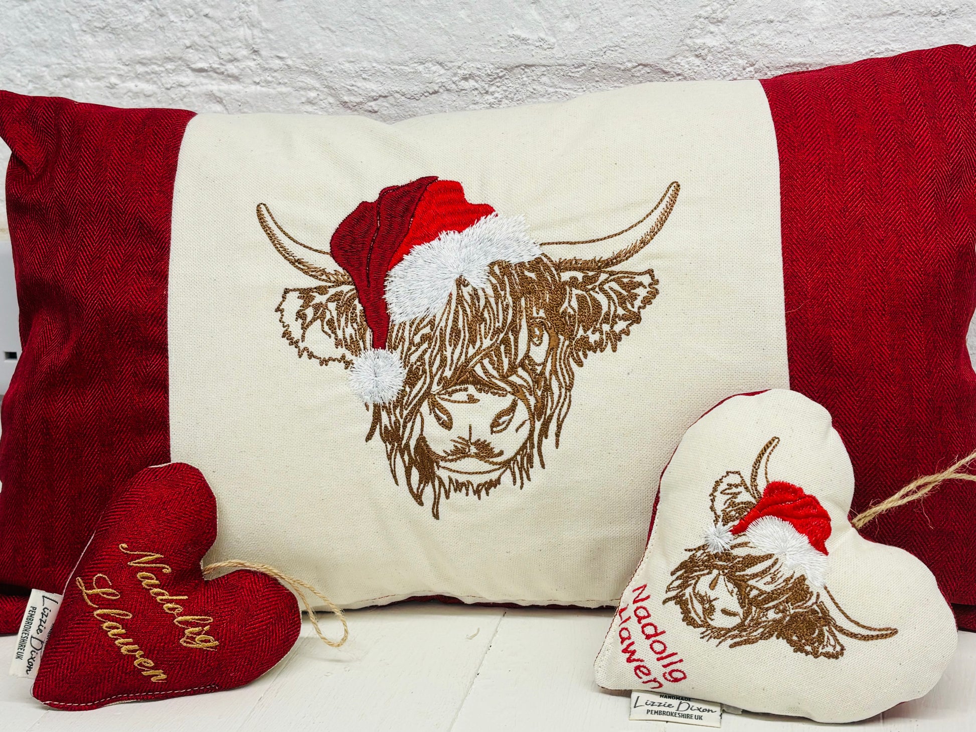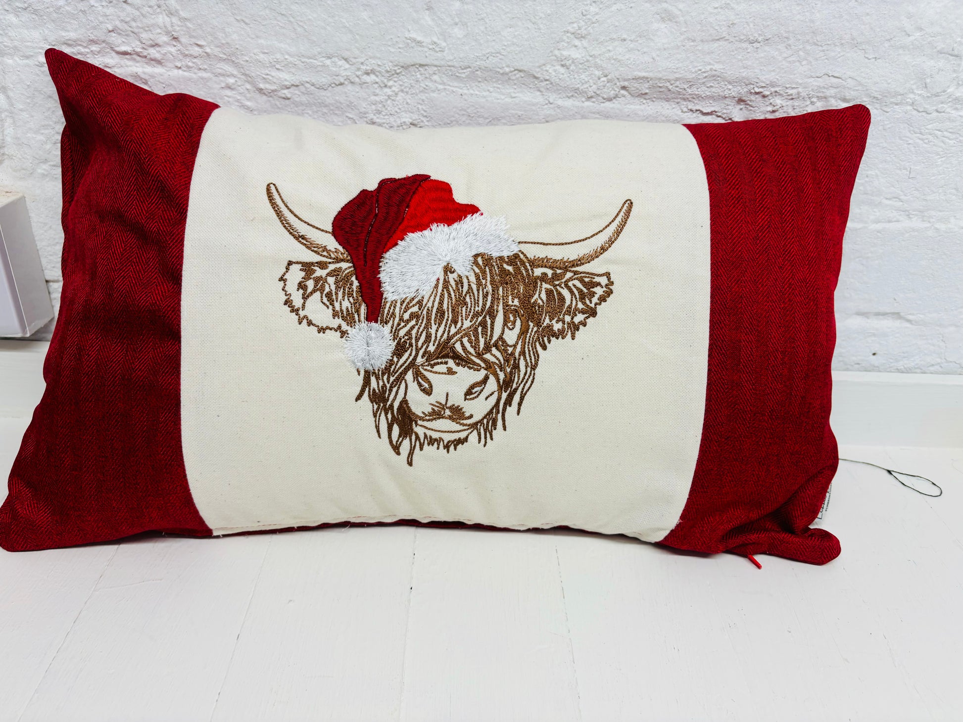Supe cute Christmas cushion. Highland Cow wearing a Santa hat. This cushion is Doubled sided with our stunning red tweed fabric, the highland cow is embroidered on a middle panel.