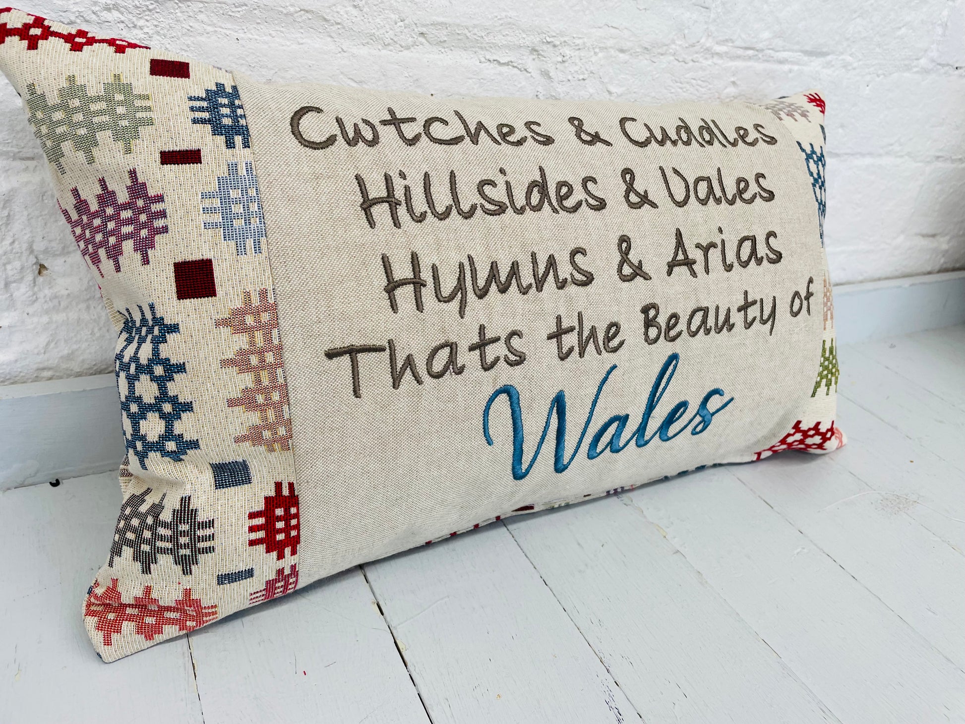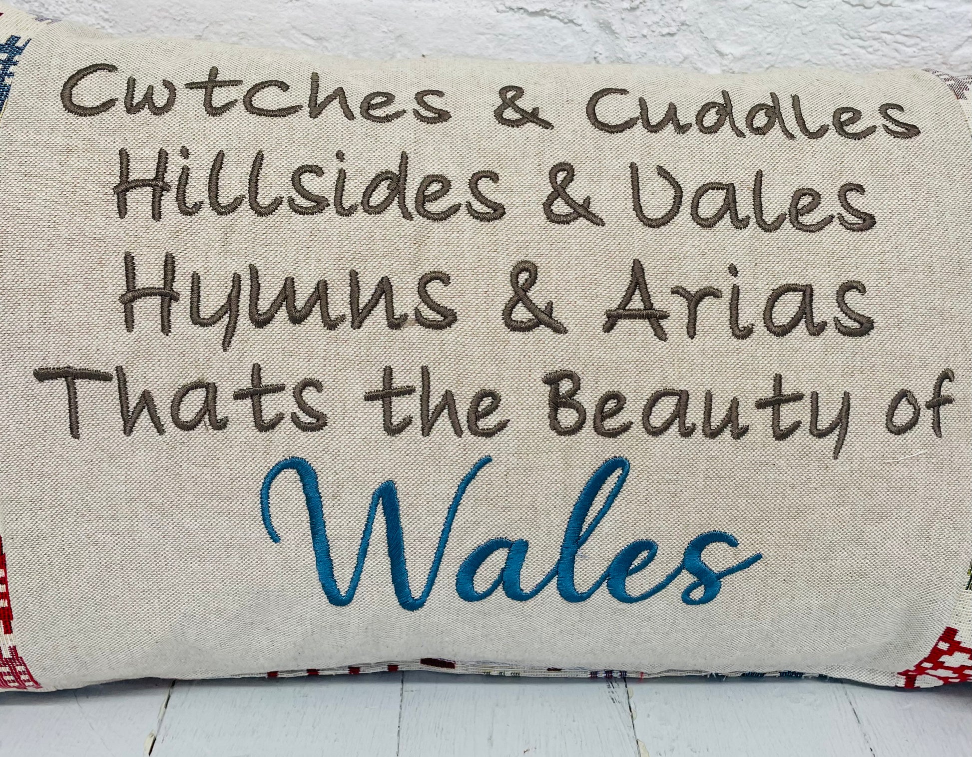 Welsh Tapestry blanket style fabric with a Welsh quote on a taupe fabric panel in the centre.