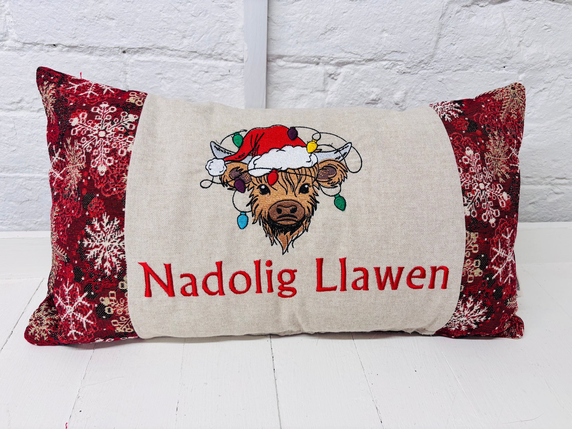 Supe cute Christmas cushion. Highland Cow tangled in the Christmas Lights . This cushion is Doubled sided with our stunning red tweed fabric, the highland cow is embroidered on a middle panel.