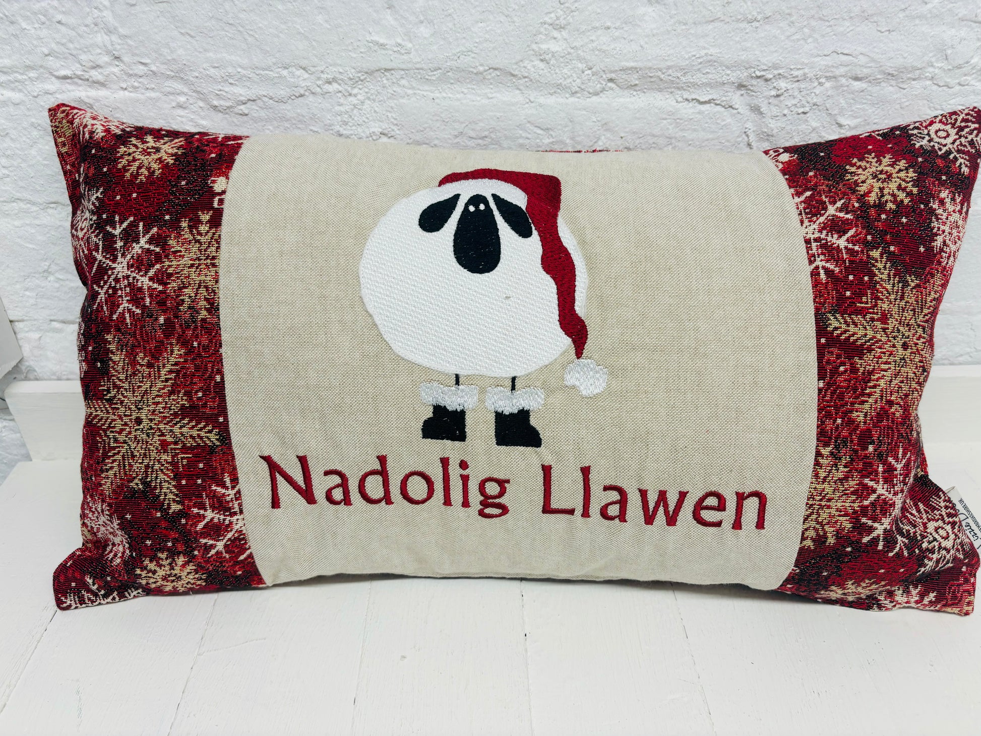 Beautiful Christmas cushion ade using our new snowflake Tapestry fabric that has a gold thread running through that really shimmers . This cushion is Doubled sided with a panel with Festive Christmas sheep embroidered on the front.