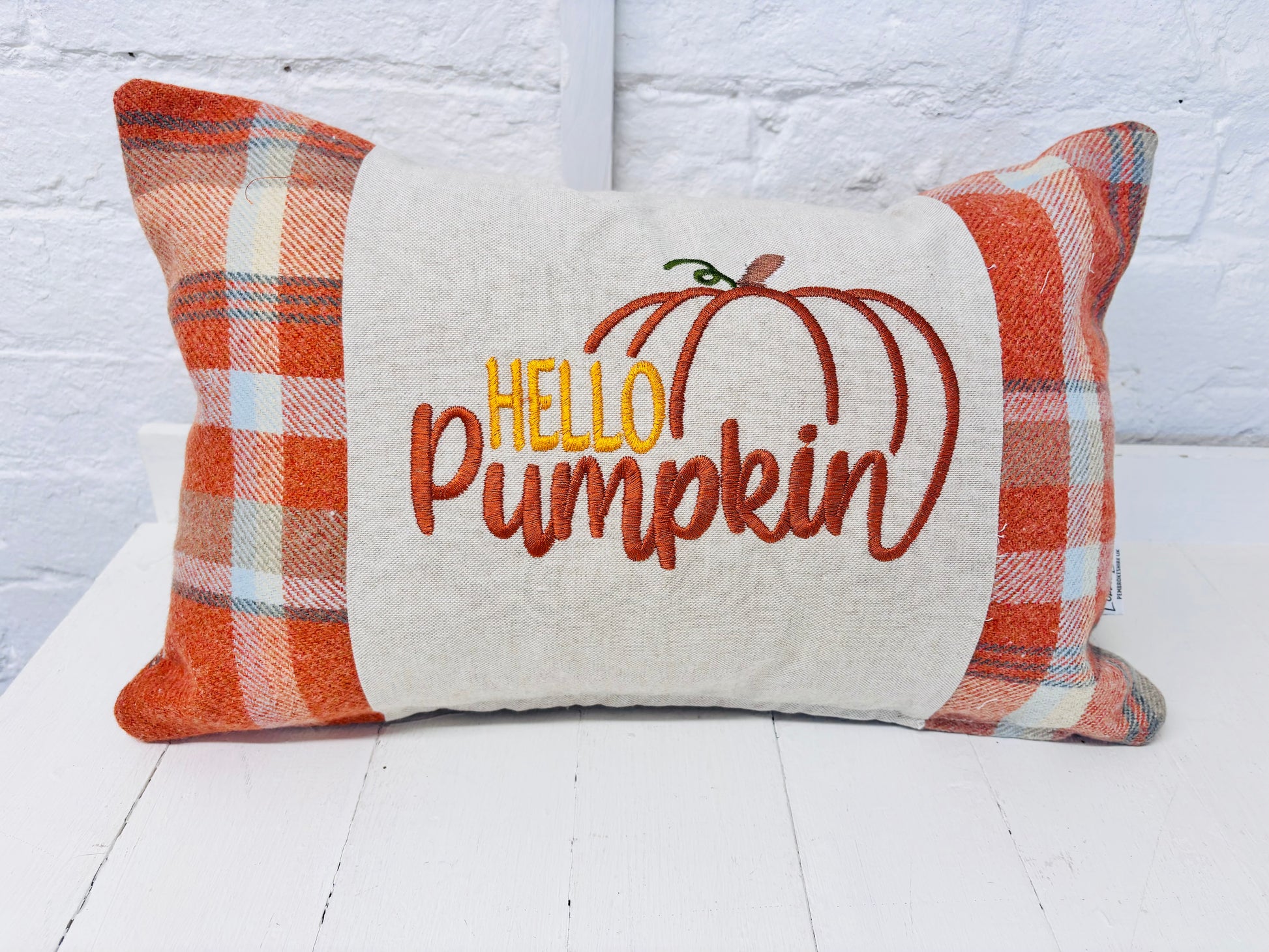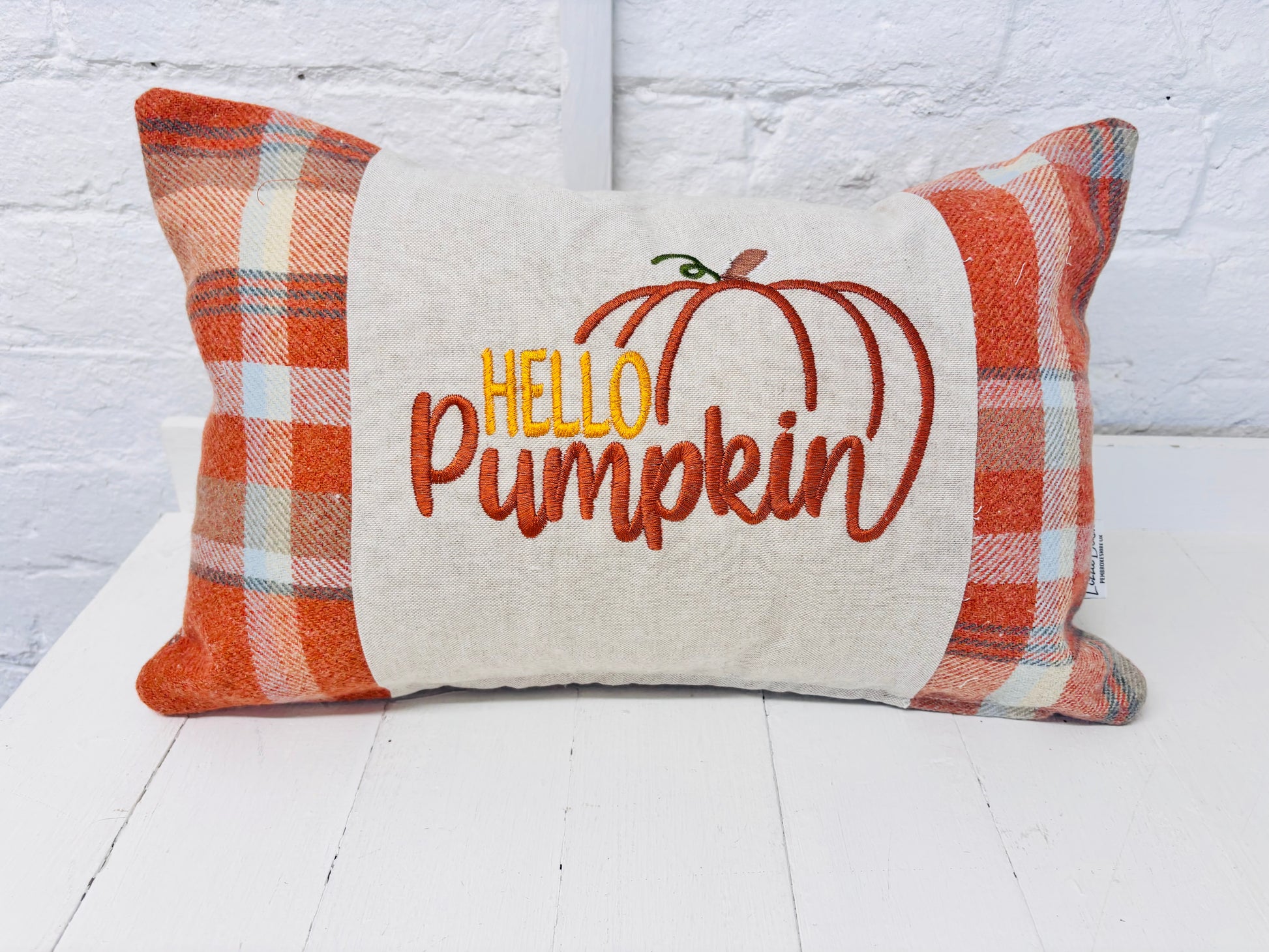 Handmade Long Panel made using our Autumn Faux Wool Fabric and cream cushion. Each cushion has a Hello Pumpkin Design embroidered on a cream panel on the front, with Autumn faux wool fabric panel on the front and on the back. Available in 2 sizes 18X12" and 20x12" All our cushions are professionally finished with over locked seams.