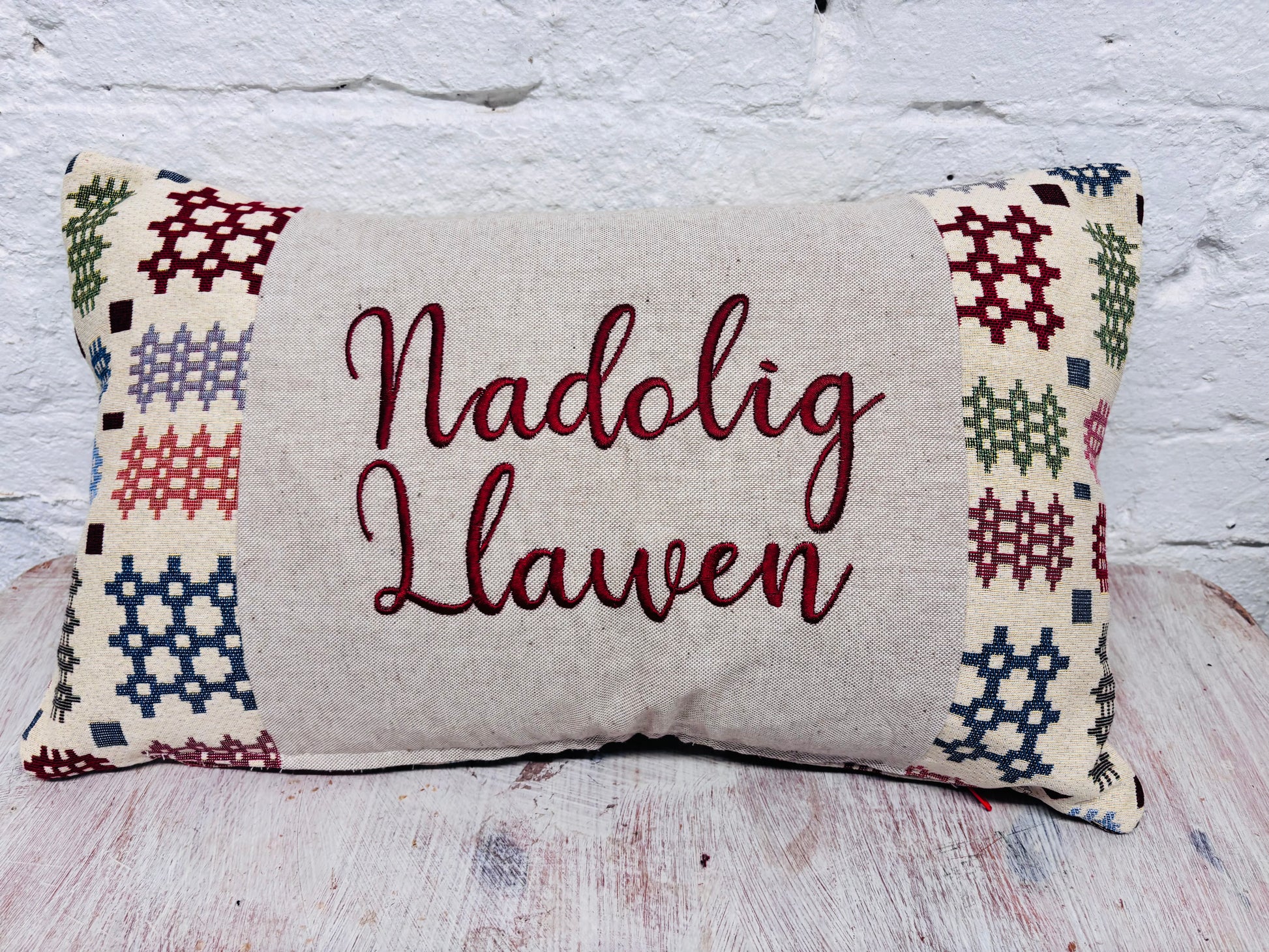 Nadolig Llawen 20 x12 Panel Cushion- in our popular Welsh Blanket. The word nadolig llawen is embroidered in a choice or Red on a central panel with the welsh blanket style fabric on the top bottom and reverse.