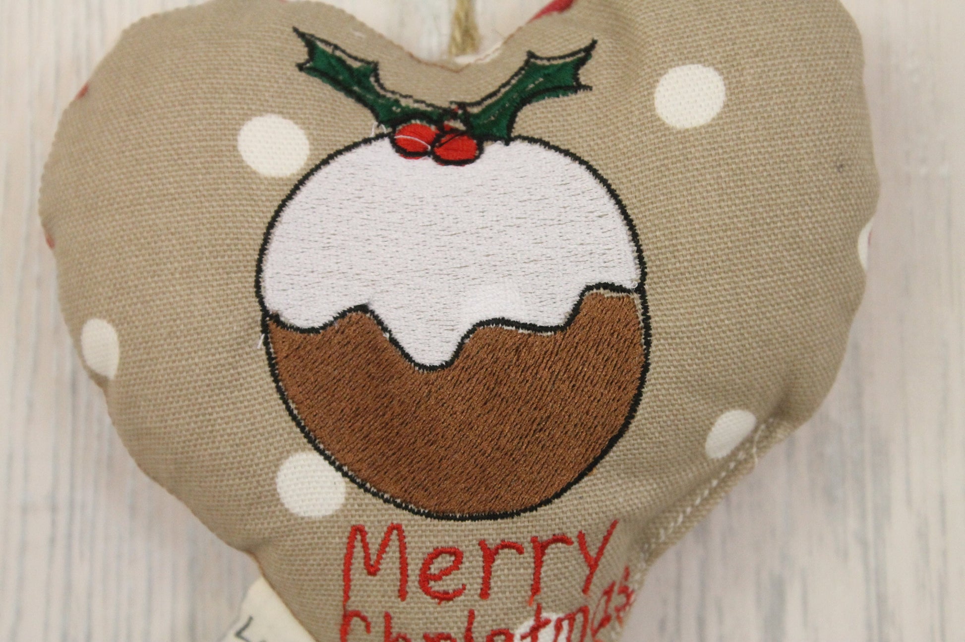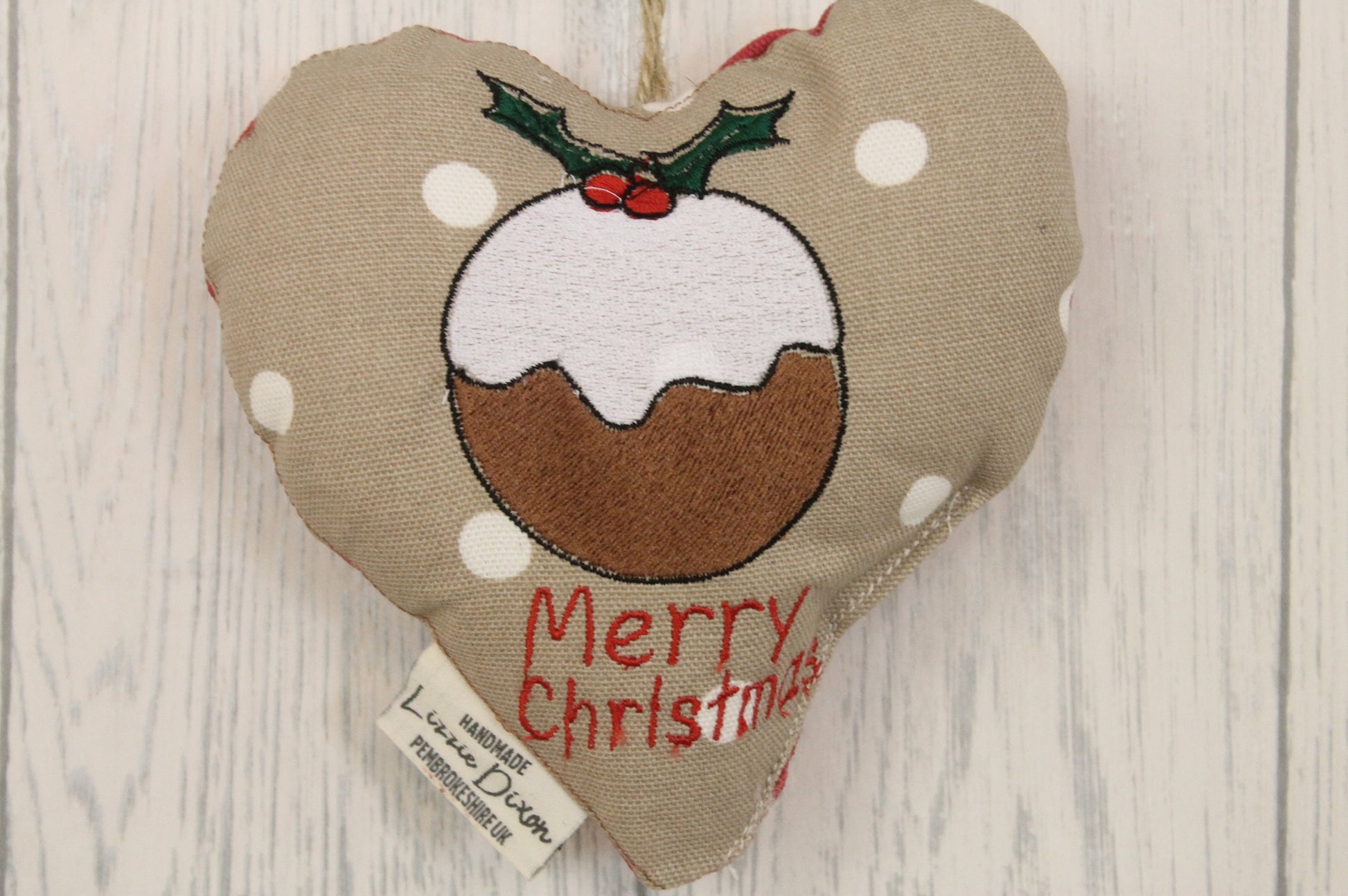 The heart is filled with a polyester filling and has a jute twine hanger.
