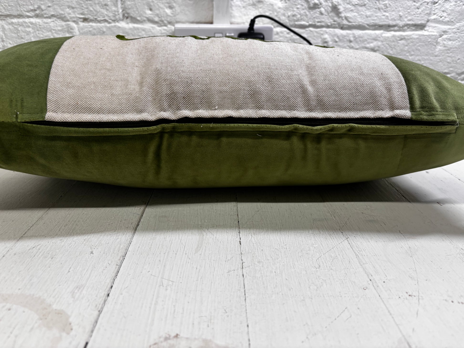 The wording is embroidered on a taupe central panel in Grey with the silky soft velvet fabric on both sides and on the reverse. Cushion measures roughly 20x12" (50x30cm) long