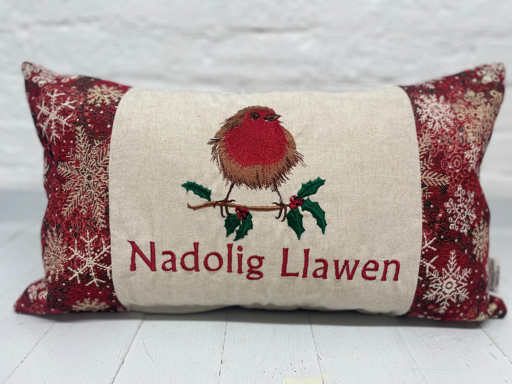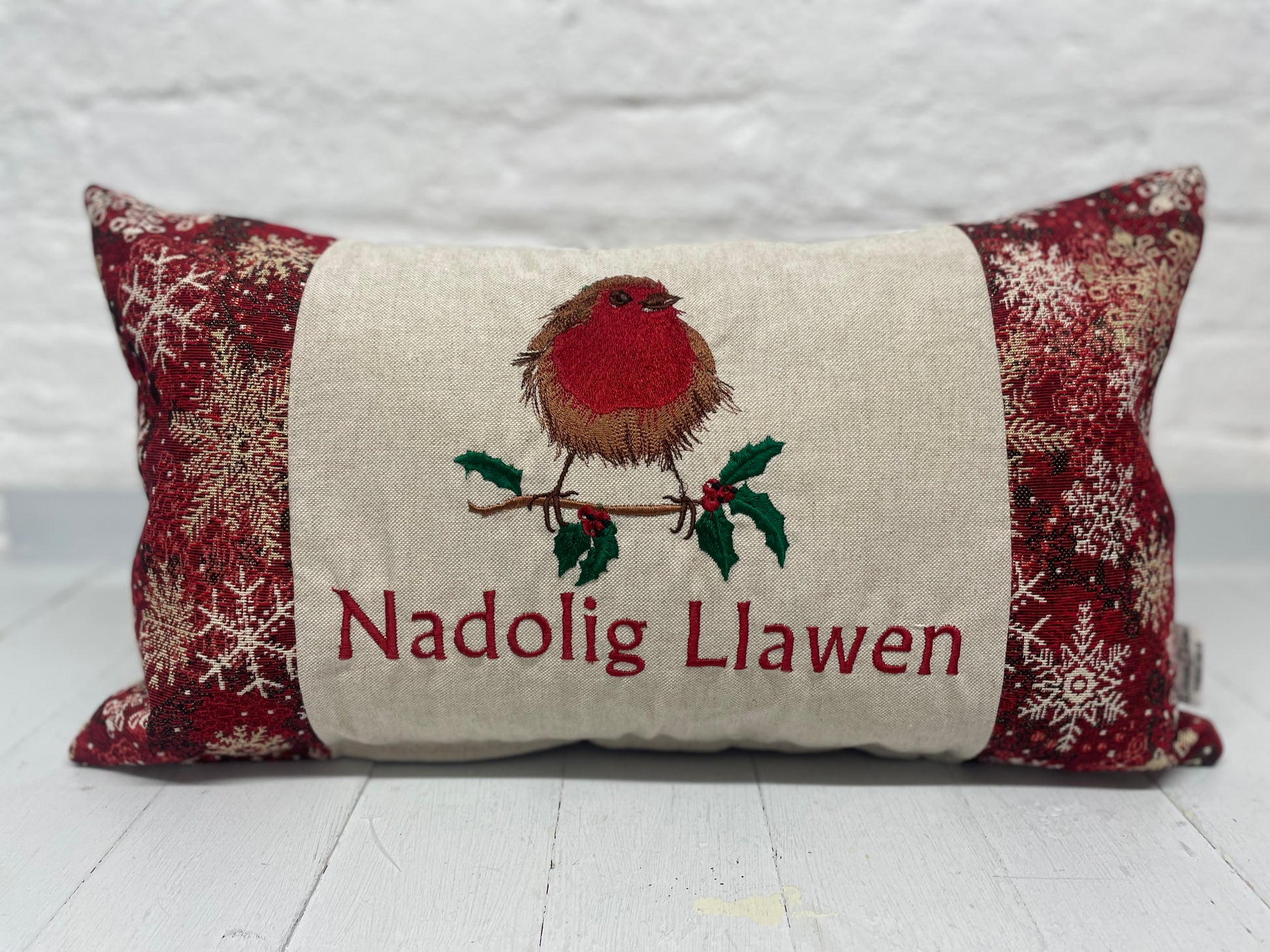 Super cute Tatty Robin with the Nadolig Llawen embroidered on a cream panel with our stunning luxury Red and Gold Snow flake Tapestry fabric on both sides and on the back .