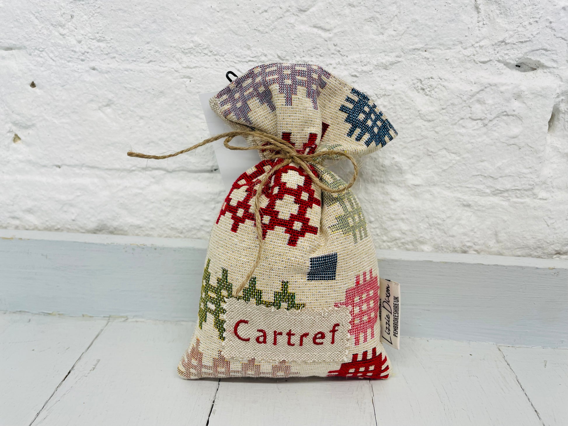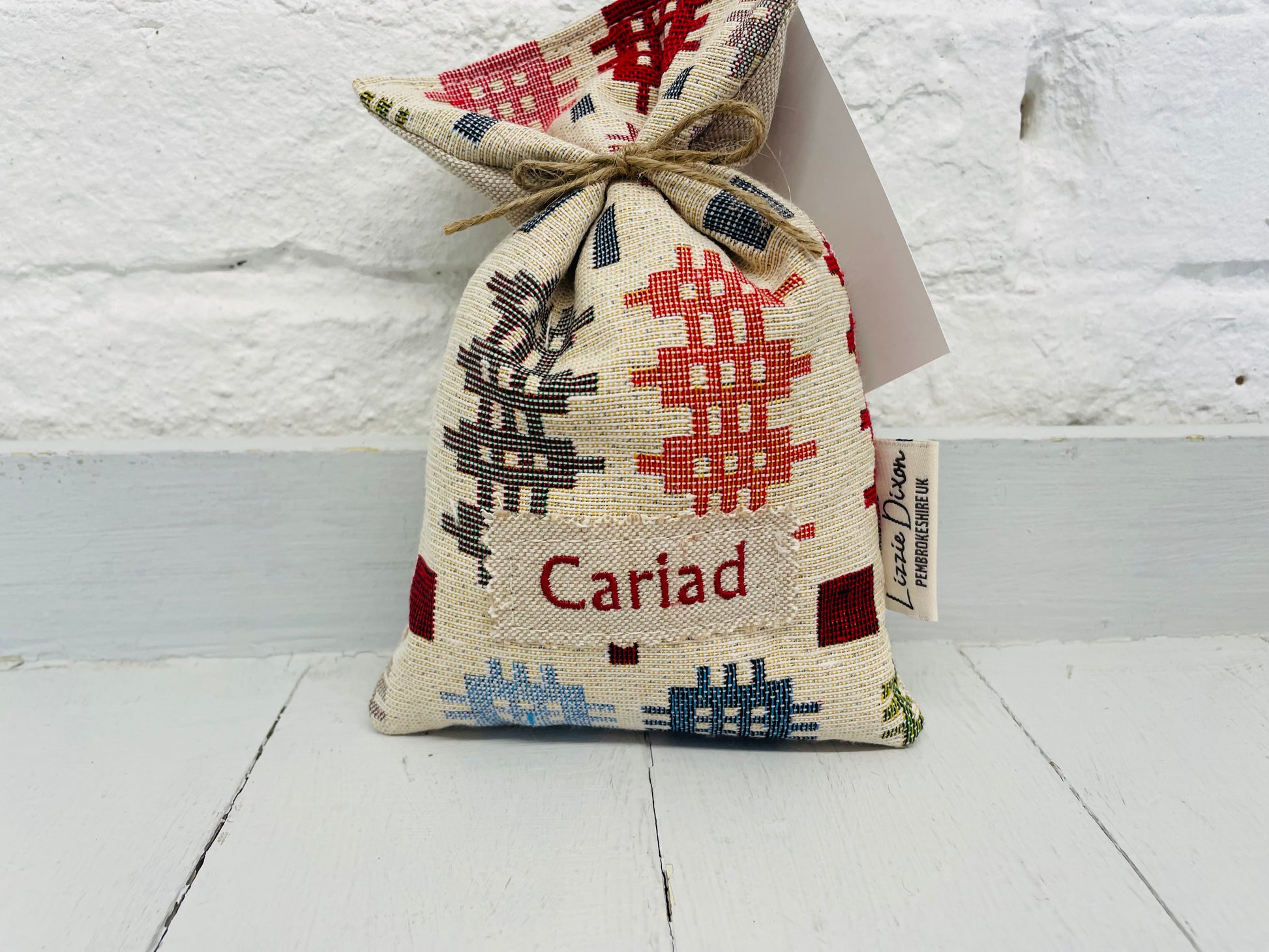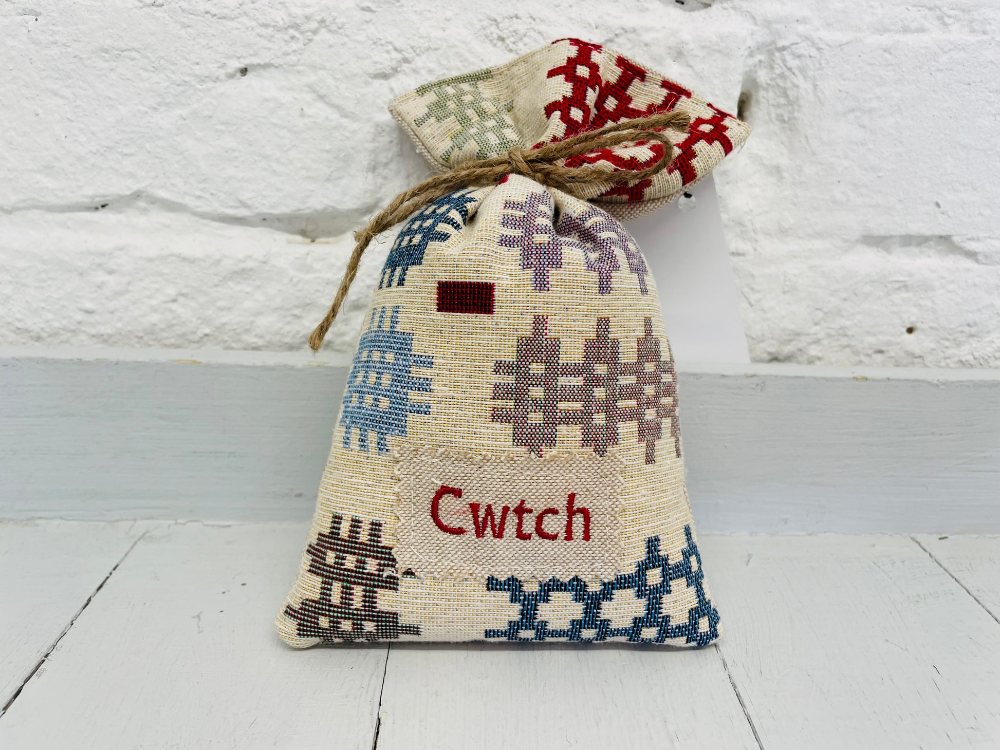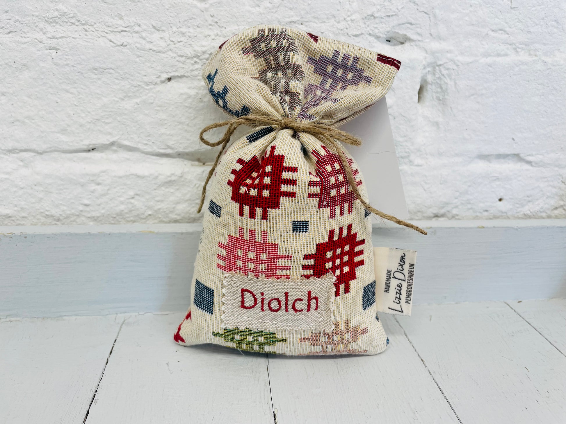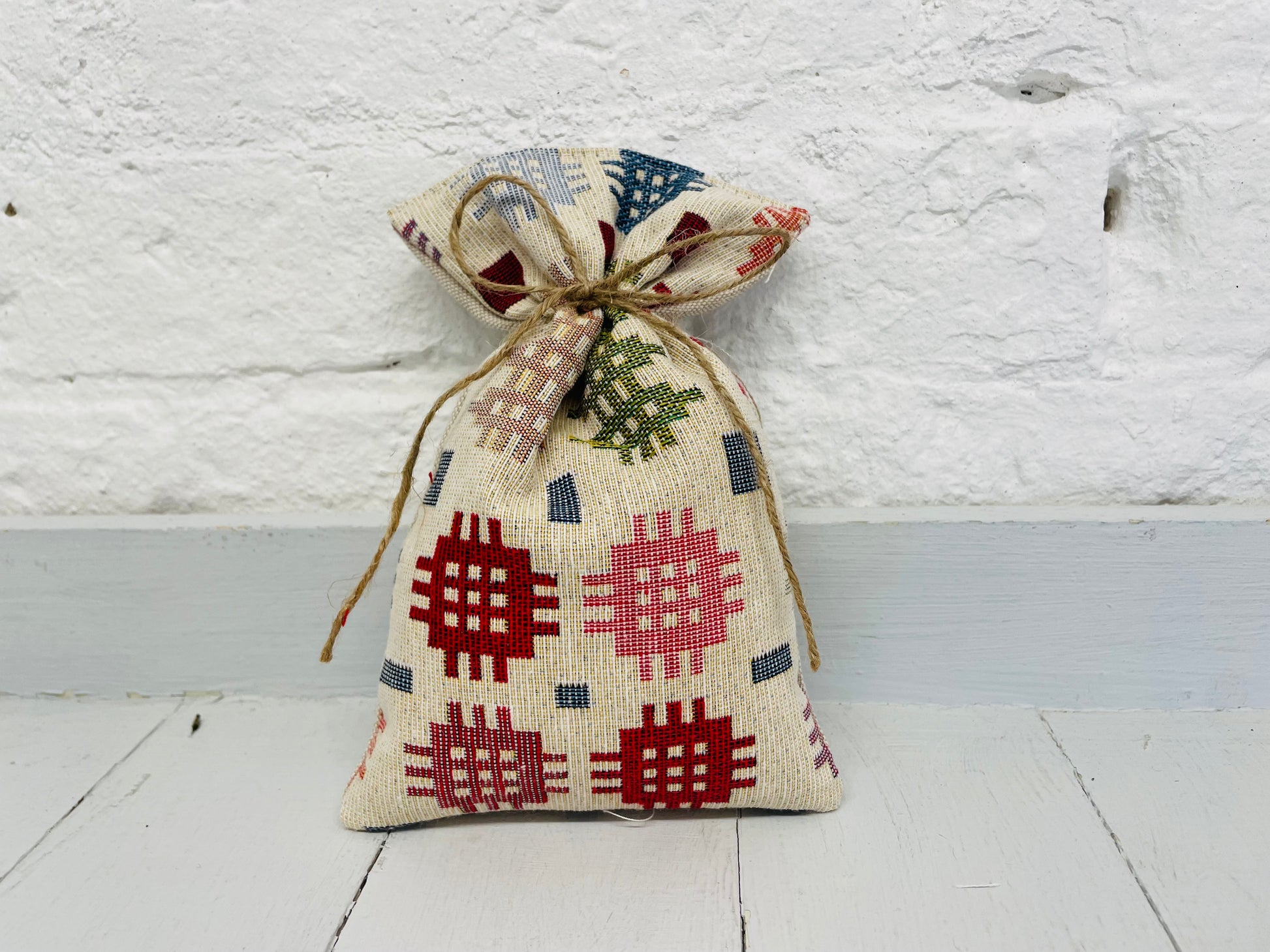 Each lavender bag is made to order using are Welsh blanket style fabric and cones with a personalised embroidered tag on the front in red Each lavender bag is filled with lavender and premium stuffing , then is tied with jute string and tied in a bow.